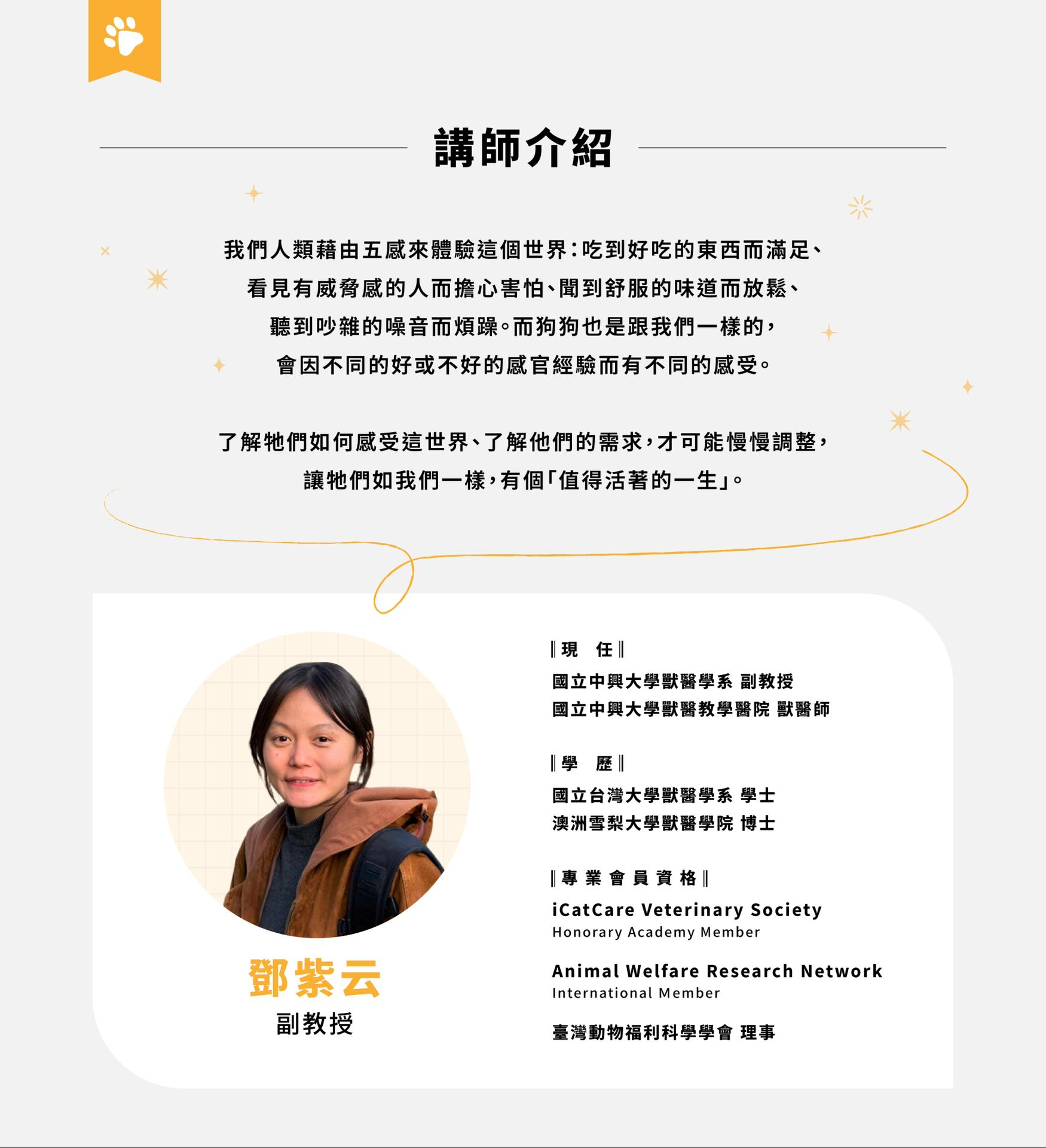 透過課程了解犬隻五感與需求,學習調整環境與照護方式,提升犬隻福祉與生活品質。